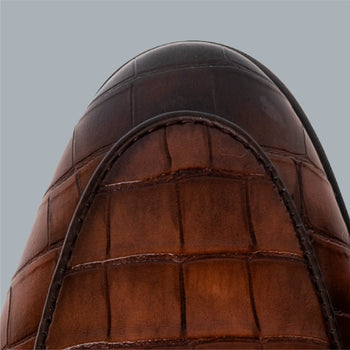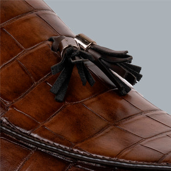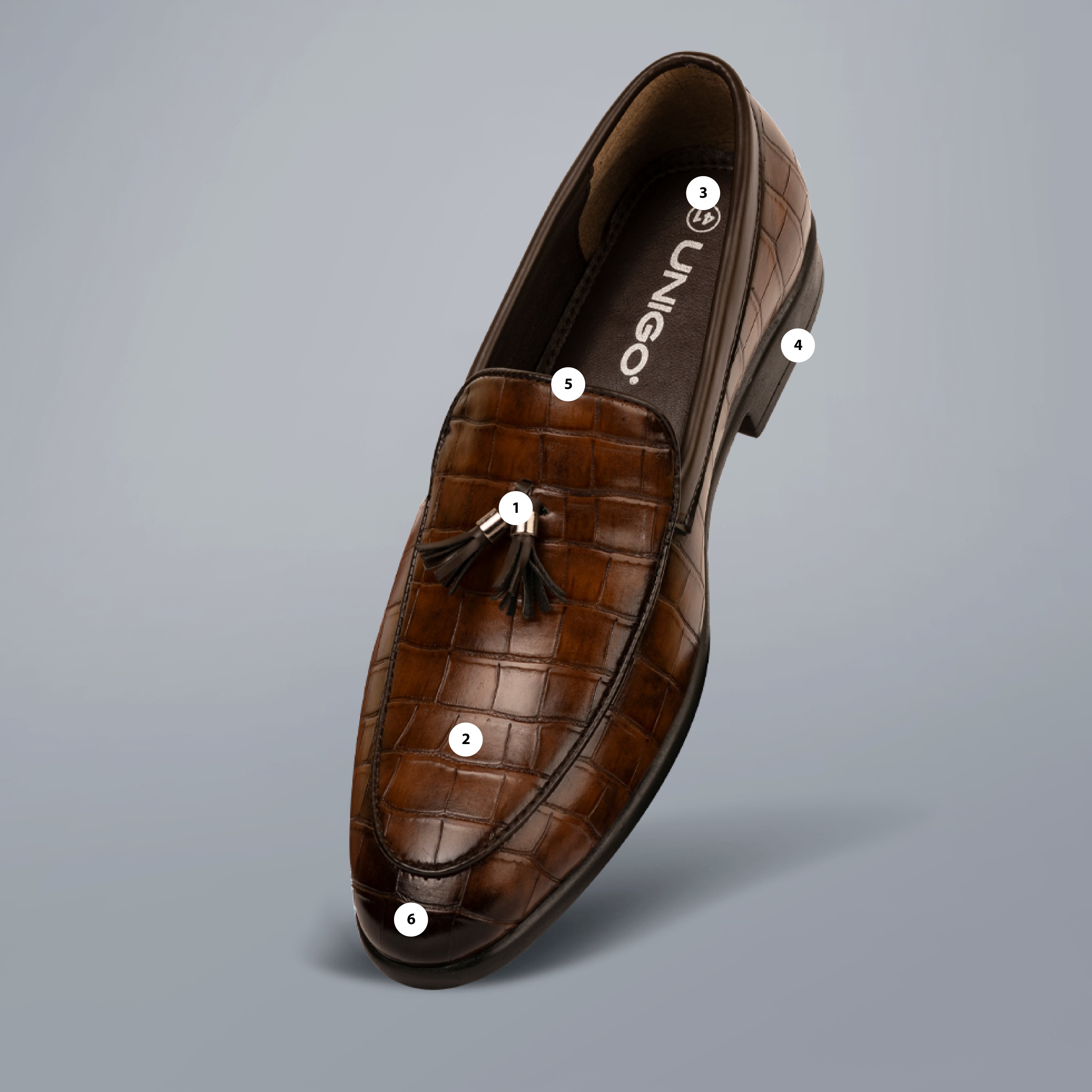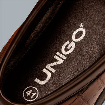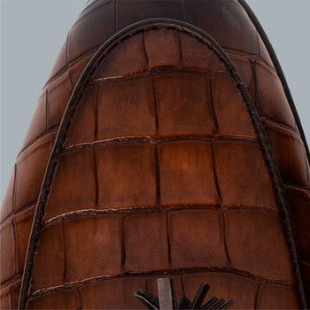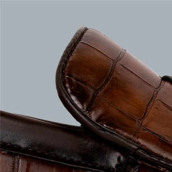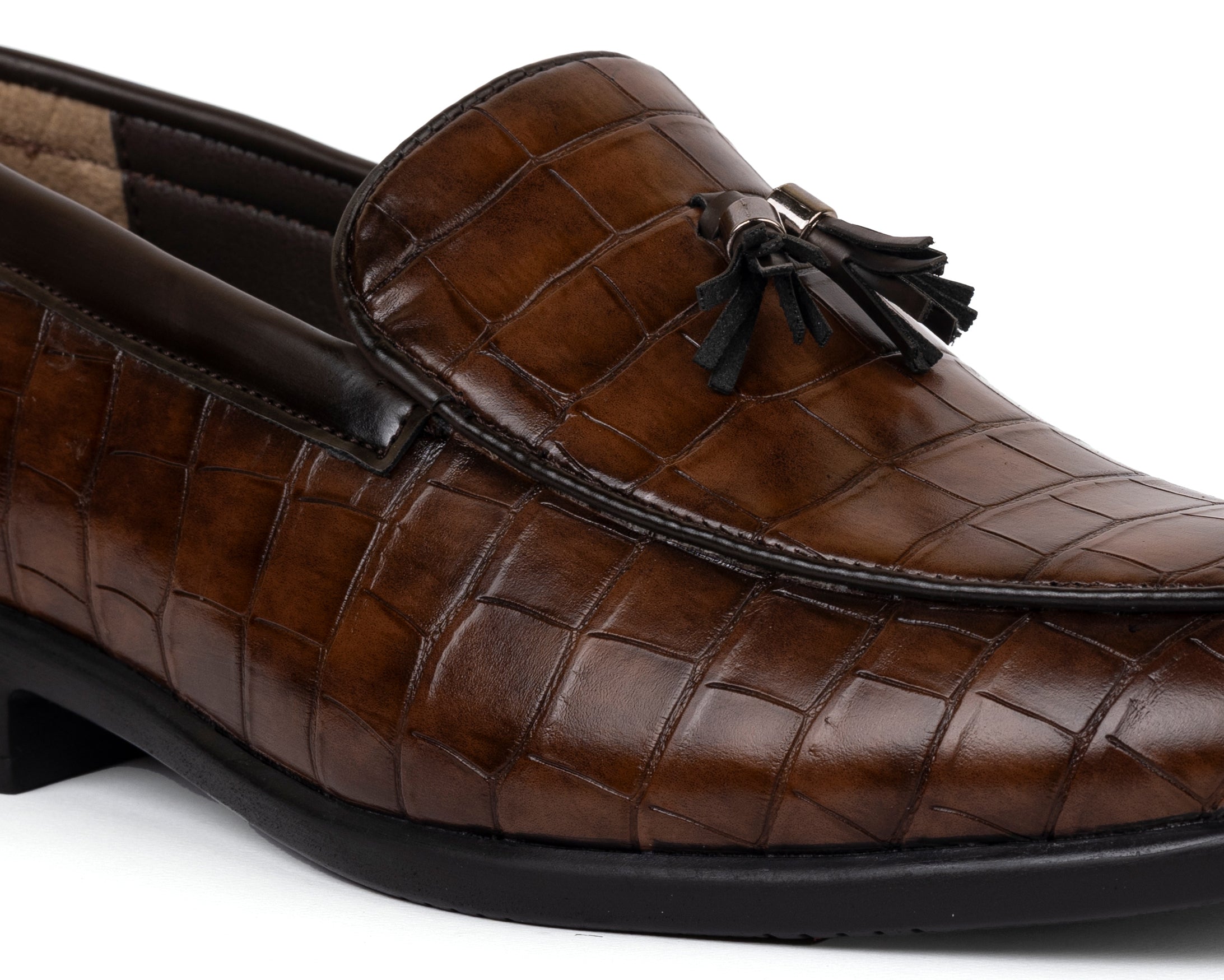 Vintage blends old-world charm with modern-day functionality. The burnished brown croc-embossed faux leather adds depth and richness, while twin tassels on the vamp offer a nod to timeless style. Designed for all-day wear, it features a cushioned insole, soft lining, and a flexible TPR sole that supports every step. The clean slip-on silhouette and almond toe finish make it a reliable choice for both formal and elevated casual occasions.